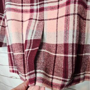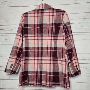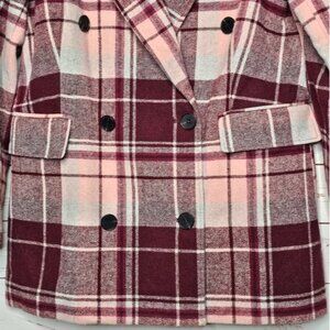 7 for all Mankind Pea Coat Jacket. Burgundy, Pink and White Plaid. Double Breasted with Interior Button Closure. Front Flap Pockets. 1 Faux Chest Pocket. Long Sleeve with 3 Button Cuff. Fully Lined. Great Preowned Condition. 90% Polyester 10% Wool. Lining: 100% Polyester. Size Medium. Flat Lay Measurements: Chest 20" Length 30" Arm 23" Shoulders 16"