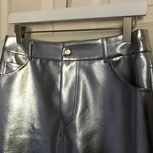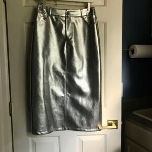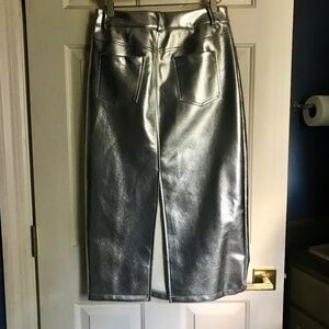 7 for all Mankind silver midi skirt, size Medium. Faux leather, front zip and button at waist. Midi length with slit in back. I took a photo of a tiny pinhole where the security tag had been, but it’s not really noticeable. Brand new condition and from a smoke free home.