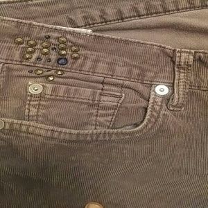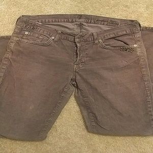 Loved pair of grey cords from 7 for all mankind. Skinny style but with a looser fit. Different clusters of blue rhinestones shown on pockets. Some fading also pointed out on front leg. 29 inseam.