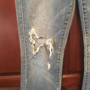 Medium Wash Bootcut jeans with fading in front & whiskering. Distressing and holes in front of jeans (see pictures). Distressing on both back pockets.