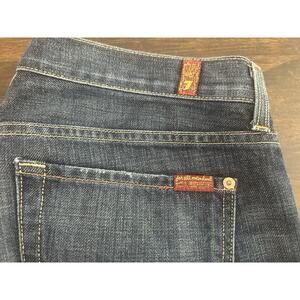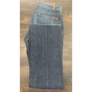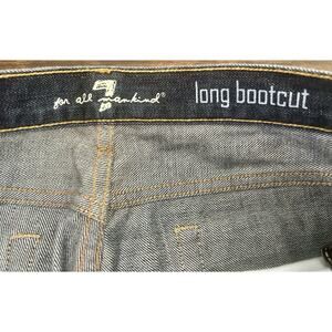 The product is a pair of 7 For All Mankind Men's Jeans in a relaxed fit, with a dark wash and extra long inseam. The jeans are a size 34 and feature a classic bootcut style, crafted from denim fabric. This style of jeans is designed for a comfortable and stylish look, suitable for everyday wear.