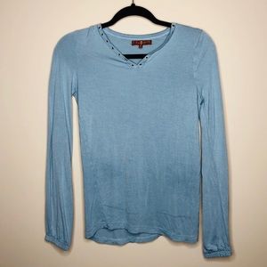 7 For All Mankind Teens Size XL (16) Tee Top Long Bell Sleeve with elastic on the cuff Soft Blue Allure color V-Neck 100% Cotton Round Metal accents on the neck The hem is just a little bit high low.: Chest: 32 Shoulder to hem: 27 Used but in good condition. Can be used by XS women.
