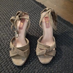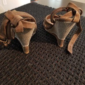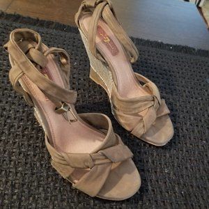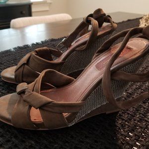 Stylish barely used wedge stack sandals from 7 for all mankind. Worn just a couple of times. The heel measures around 4'. The material is a waxy nubuck leather- velvety touch. The color can be best described as an green -brownish color. Color is similar to an army green. 2nd photo closes matches the actual color. The size is an 8M.