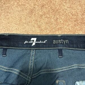 7 for all mankind austyn jean waist is 40, these have been professionally hemmed and the inseam is now 27 inches.