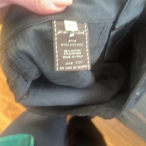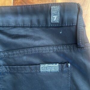 27” waist, 32” inseam, material is sort of a coated, satiny finish, single button, front zip