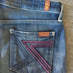 Purple pocket details, 9” Flare leg, 98% Cotton, 2% Lycra