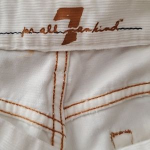 7 for all mankind ivory corduroy jeans with light brown stitching, zippered front, 2 back pocket, 2 front. Great used condition
