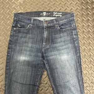 Dark wash seven for all mankind highway straight leg waste 27 inches, rise 9 inches, inseam 32 1/2 inches. No holes or rips. Mild wear pictured.