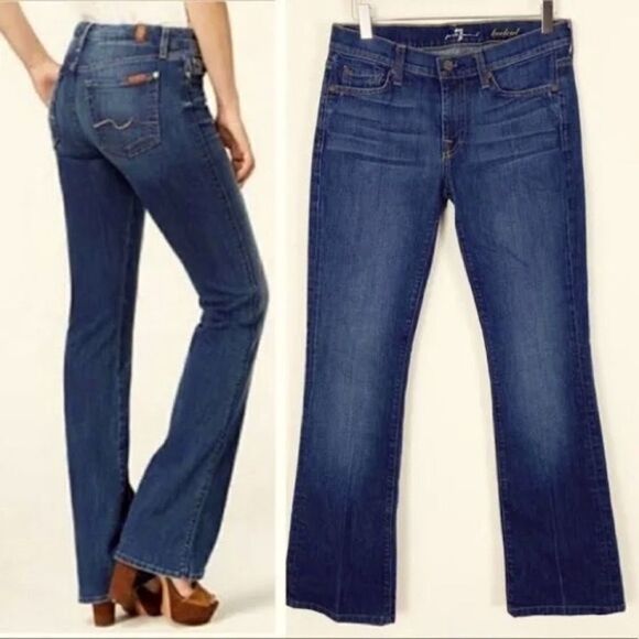 7 for All Mankind rodeo, cowboycore, dark wash, bootcut jeans. Low rise. In good, used condition. Approximately 15 inches across the waist, 7.5 inch rise, 30 inch inseam. From a pet and smoke free house. Happy to bundle!