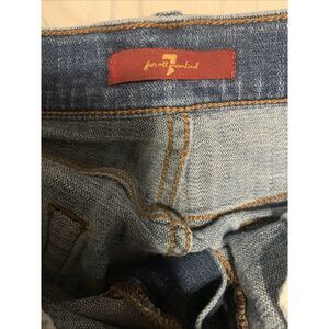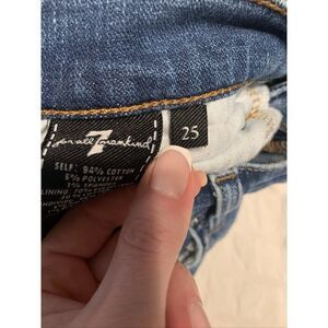 The product is a pair of 7 For All Mankind Women's Blue Distressed Mid Rise Jean Denim Shorts in size 25. These denim shorts feature a distressed look, a mid-rise fit, and a 4.5" inseam, making them a stylish and versatile option for women's summer wardrobe. Made from denim fabric, they offer durability and comfort while showcasing the brand's quality craftsmanship. Perfect for casual days out or lounging, these shorts are a fashionable addition to any woman's clothing collection.