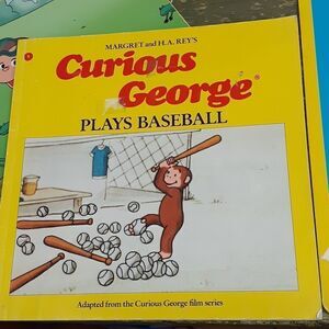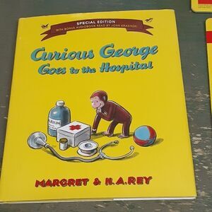 7 pc bundle of Curious George & 5 books, & 2 puzzles. 2 hard cover books, 2 softcover books and 2 puzzles 14" H. X 10.5" W. Curious George is approx. 15" H. X 16" W. with outstretched arms. Preowned. In good conditon. Loved a lot. Great Valentine bundle - even a special Valentine book.