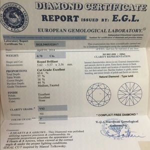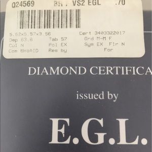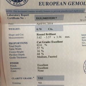 .70 TCW White gold Bailey Banks & Biddle brilliant diamond engagement ring. EGL Certified clarity: VS2, color grade: F, Round solitaire brilliant diamond measures: 5.62 - 5.57 x 3.56 mm. Size 7. Bought in 2014, worn for 3 months and has been in the box since. It's like it's never been worn. Great condition. See photos for details.