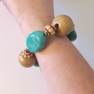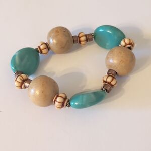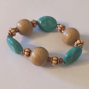 Chunky Cream and Turquoise Wood Beaded Stretch Bracelet