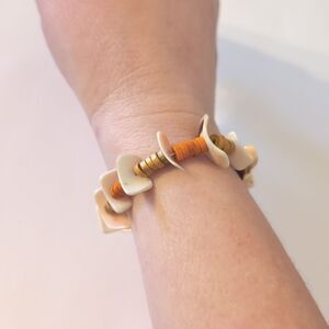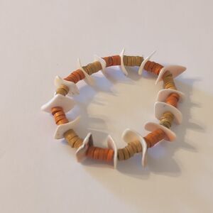 White Shell Tan and Orange Wood Beaded Stretch Bracelet