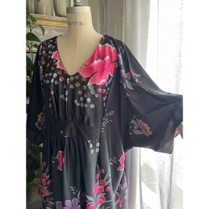 70s 80s DiCarlo of California Maxi Kaftan Dress Black Floral Boho Caftan Hostess