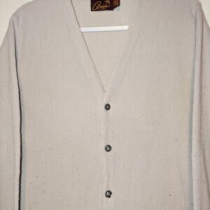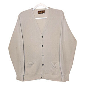 Description: Vintage 70s Arnie Arnold Palmer Cardigan Sweater, Acrylic button down sweater, Two front pockets, gray cream like colorway, preppy golf cardigan, grannycore, grandpacore, perfect for fall and winter