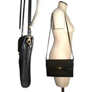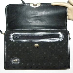 Vintage 1970s Pierre Cardin Logo Bag with Leather trim in black. Shoulder strap is removable for clutch. One slip pocket on outer back wall of purse, one zip pocket under flap, interior has zip pocket on back wall. Gold tone hardware