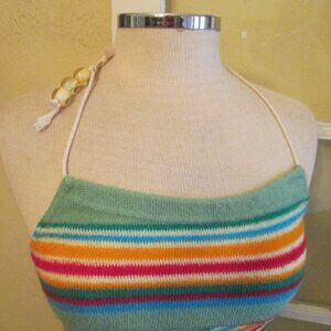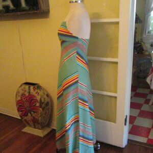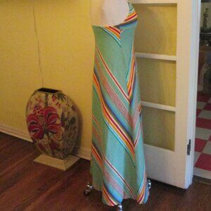 This very hip1970s green striped maxi empire waist dress is so different and cool. It has a string attached tie halter with little glass beads. It is made of a terrycloth type of material and is labeled Palmers and Made In Italy. It seems like an XS or XXS as it's marked 0, but please see measurements below.