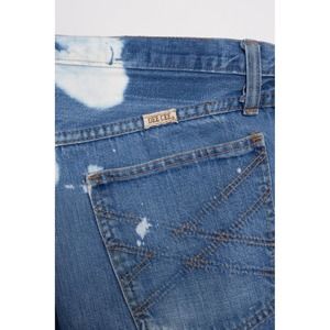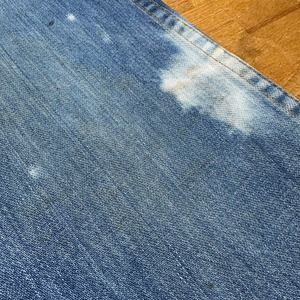 Condition: Lightly distressed, with scattered bleach spots and some other spots and discolorations (see close up example photo), some missing threads in the contrast stitching (most notably on the back pockets), a 1/4" hole at the bottom of the back left pocket, and a section of the front and back rise seams has been redone by a previous owner in a blue thread as opposed to orange.
