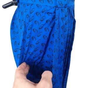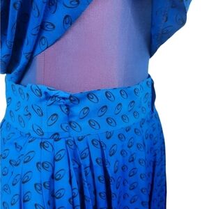 Features royal blue color (not as bright as the pictures), mock collar neck with key hole back and 2 buttons, shoulder pads, short sleeve, skirt is high waist with hidden back zipper with 2 front pockets and hidden zipper, Pleated in front and back with pockets, belt loops, rayon feel, Scribble Polka Dots all over.