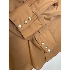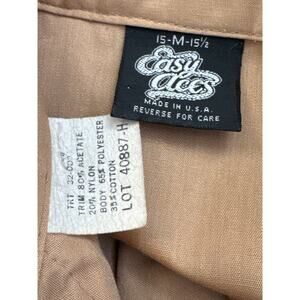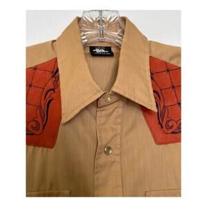 Step into classic western style with this vintage 1970s Easy Does It pearl snap shirt. Made in the USA, it features a golden tan sheer poly-cotton body with bold rust suede-like yokes embroidered in navy scroll and grid designs. Finished with pearl snap buttons, two chest pockets, and long sleeves. Lightweight with a subtle sheen, perfect for rodeo, line dancing, or a standout retro cowboy look. Size 15–15.5 (Men’s Medium). Excellent vintage condition. A true western wear collectible.