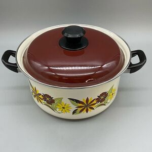 70s Floral Enamel Ware Dutch Oven Stock Pot Double Handle MCM