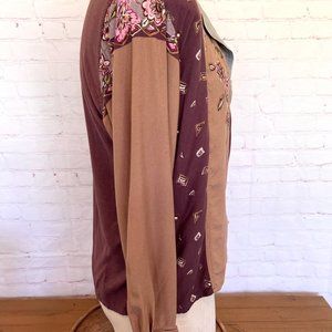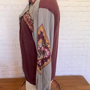 Burgundy, tan and gray half zip shirt has a very unique floral design on the front, sleeve and collar.
