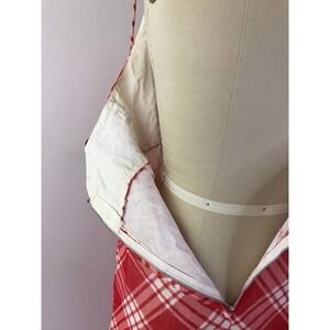 Long vintage maxi dress with beautiful details. A-line empire waist dress with a long maxi skirt. Covered in an all over red gingham pattern, with embroidered floral details. Removable sheer blouse that layers with the dress. Wear it together or separately. Dress fully lined. Metal back center zip with hook/eye closure.