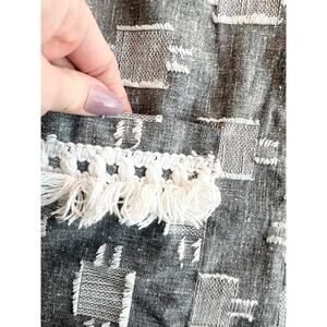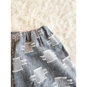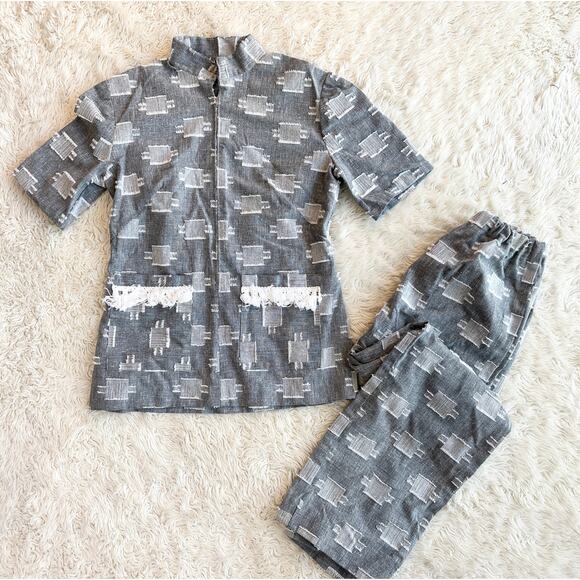 Adorable slub knit grey top and pants. There is a fun white fringe pattern throughout-I don’t know exactly what you’d call it but each white stitched square has fringe on either end.