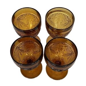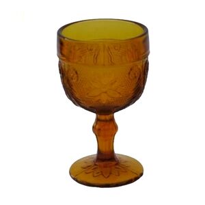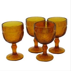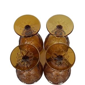 Excellent pre owned condition. 70's Indiana Glass Amber Sandwich Daisy Pattern Goblets Set of 4. Four stemmed goblets, Height: 5 1/4" Diameter: 3 1/4" Capacity: 8 oz. No chips stratches or cracks