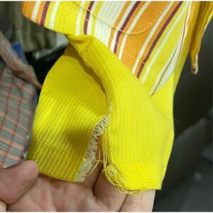 70’s Little Boy Yellow, White, and Orange Outfit. Overall shorts have elastic and since it’s so old, it’s all worn. There are also spots. It’s so cute though. No size tag, I assume 2T-3T but measurements are provided in pics.