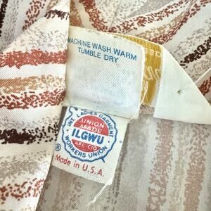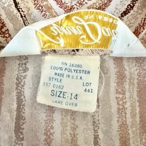 This 1970s Lynn Davis midi dress in size 14 features a rust red color with a tie neck and striped secretary style. Made from polyester and with a bohemian look, this retro dress exudes a casual and unique charm. With its original design and United States origin, this dress is a standout piece for anyone looking to add a vintage flair to their wardrobe.