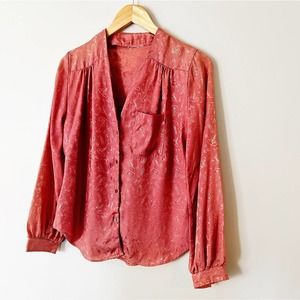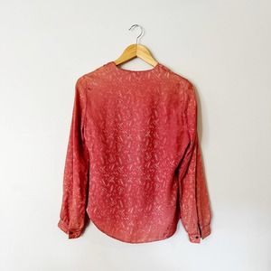 Vintage 70s mauve pink shiny blouse with cocktail dinner print throughout. V neckline. Front pocket. In excellent condition.