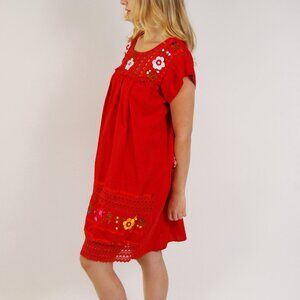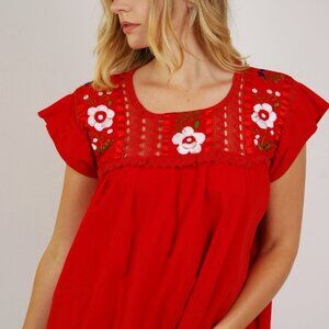 • Flower power! Bright red shift babydoll cut mini dress with multicolor floral and leaf embroidery, crochet, and ribbon detail on neckline and hem. Short straight cut sleeves. Square neckline. Pleats in back.