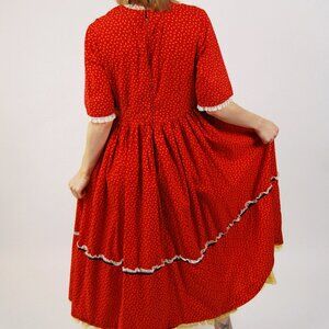 • Red and ravishing! Red a-line maxi prairie dress with yellow floral print, fitted drop waist, full pleated skirt, decorative lace trim on sleeves, neckline, and throughout, and buttons down front. Has lacy ruffled layer underneath that shows through slightly and adds volume. Zipper in back.