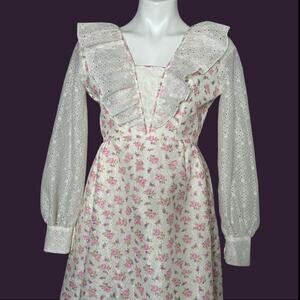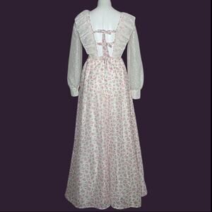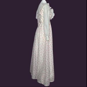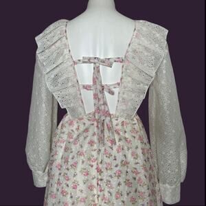 Beautiful 1970s prairie maxi dress with pink floral print, white eyelet sleeves, and a ruffled V-neckline. Features a dramatic open back with two adjustable ties, long puff sleeves, and a full A-line skirt. Perfect for cottagecore styling, retro bridal looks, festivals, photography, western wear, and vintage collectors. Shown on a size 6 mannequin; fits like a modern Small. Please compare measurements for best fit.