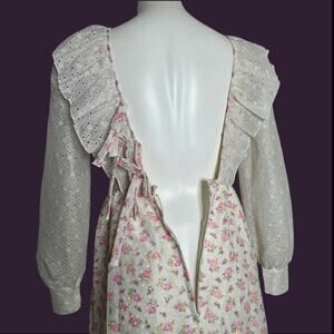 70s Prairie Maxi Dress Floral Eyelet Ruffle Open Back with Ties, sz Small