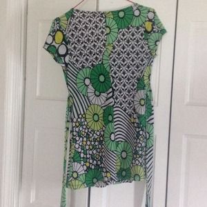 ST PATTY'S PERFECTION! Big, splashy print. Scoop neck, tie-back. This top is PERFECT for travel. Simply will not wriggle. Excellent condition. No snags, stains or pilling. Really fits more like a small. 3rd pic is truest to colors.