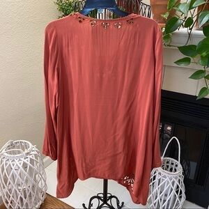 Such a gorgeous rust colored dress. Perfect for the summer months as a dress or cover up. Also perfect for the colder months to wear leggings underneath with a belt and knee high boots. It’s in excellent condition. Size is large. Brand is unknown.
