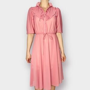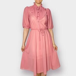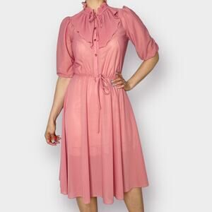 1970s midi length dress with 3/4 short sleeves and ruffle collar details. Elasticized at waist with thin tie. Button front closure on top. Dress is semi sheer-shown here with a full slip underneath (slip not included).
