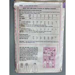 Vintage Simplicity 7023 sewing pattern featuring boys' vest and jeans ensemble, Size 4 (Chest 23"). Includes applique transfer. Previously cut and used, all pieces intact.
