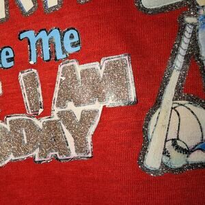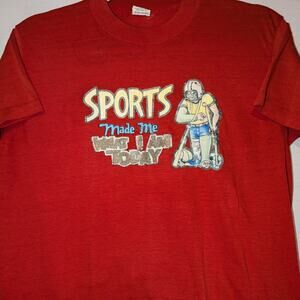 Description: Vintage 70s Sports Made Me What I AM Today Roach t shirt, iron on graphic, red yellow blue and glitter design, front graphic only, injured sports player, football, baseball, soccer, basketball, volleyball, funny comedy quote tee