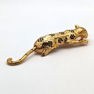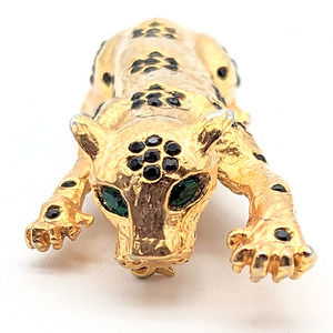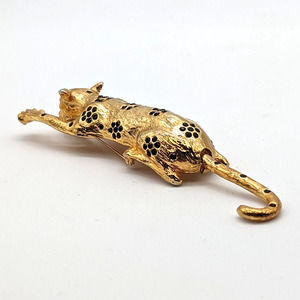 70s Spotted Leopard Brooch w Black Rhinestone Flowers Green Eyes Dangling Tail