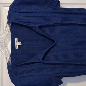 Deep blue top with textured design. Short flutter sleeves and tie detail.