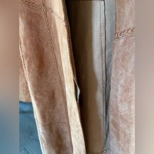 This beautiful Coldwater Creek women’s genuine leather vintage jacket is in a rust (burnt orange) color—size 10P. It’s a long coat with cute boho stitching for a western feel. For reference I’m typically a size medium/8 and I’m 5’7”.