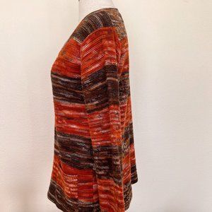 Funky multi color sweater is in the fall colors of rusts, browns, black, beige and white
