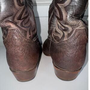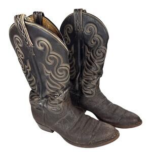 VTG black label from the 1970s. Spiral swirl piping design on shaft. Dark chocolate brown color. Exotic elph hide on on almond toe, leather on shaft. Made in El Paso, Texas, USA. Great preowned condition, no cracking, minimal wear to leather on shaft and pull tabs, see pics. Professional, highly rated seller, quick shipper, open to offers! Multiple vintage items available, bundle to save!
