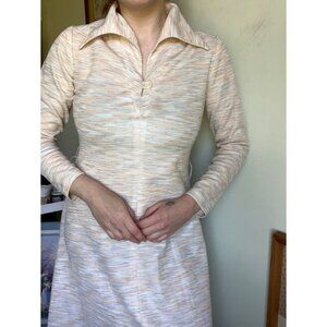 absolutely stunning polyester space dyed cream dress with beige, very light orange, tan & light blue streaks creating a gorgeous pattern. has dagger collar and unique neckline. zips in the back and has belt loops. in excellent condition. tag size 10 but would best fit a small/medium, shown on a size 36" bust, 27" waist, please refer to measurements below to ensure fit.