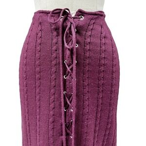 70s VTG Lace Up Front Cable Knit Sweater Skirt Plum Ankle Length Sz S/M