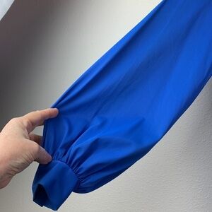Vintage size 10, fits like a medium or small, note the buttoned cuffs fit a slender wrist. Posting as a small b/c the top should have a blouson effect and waist is drawstring.